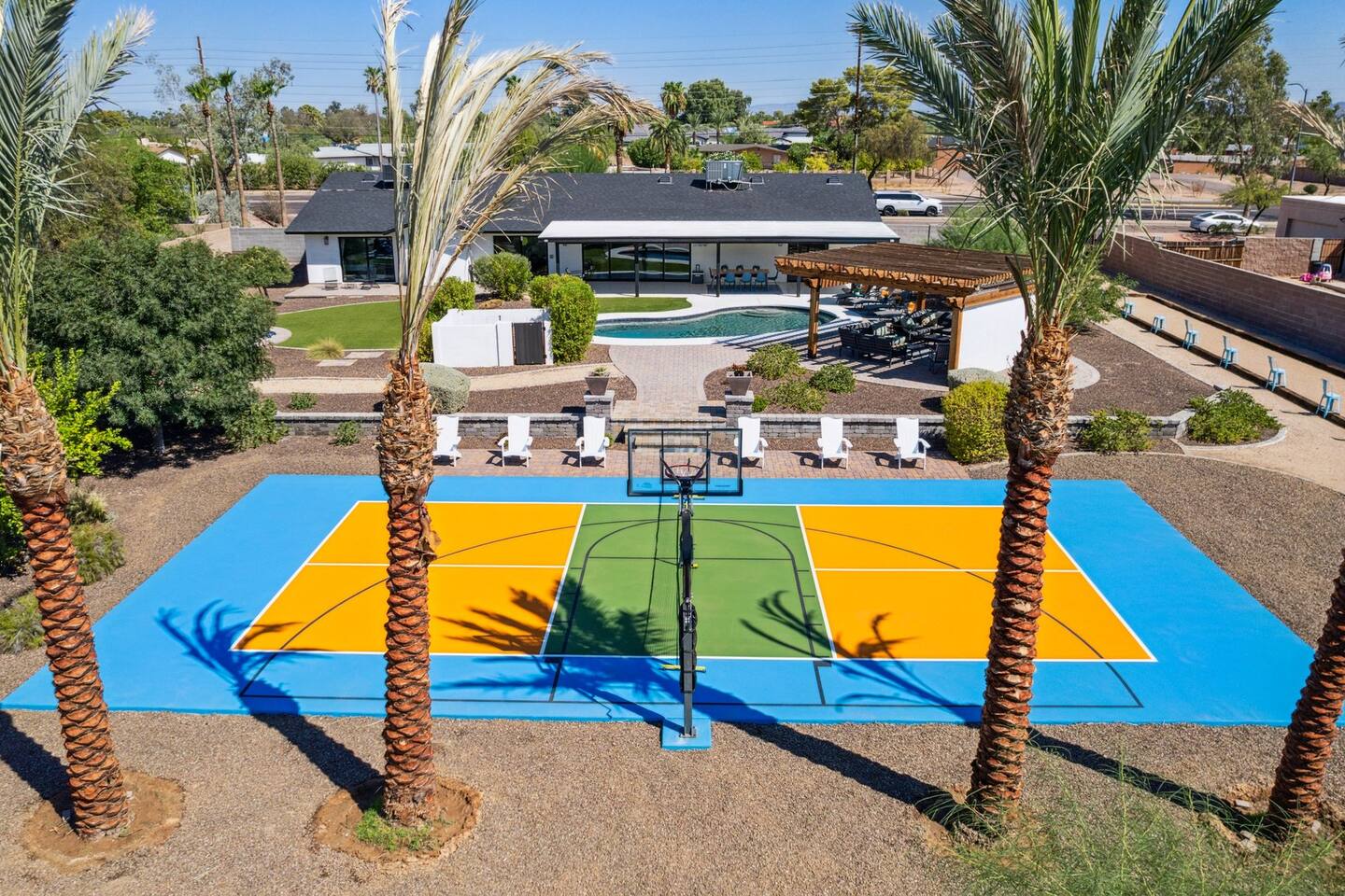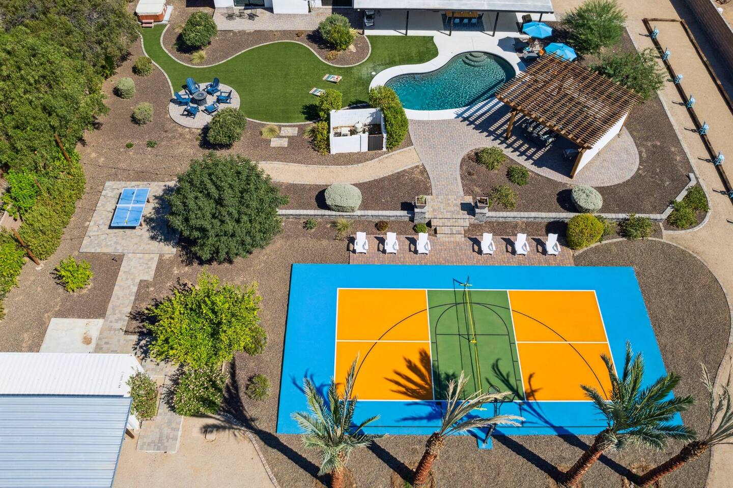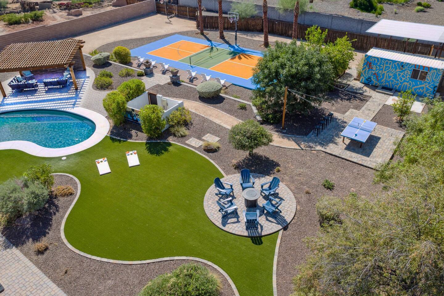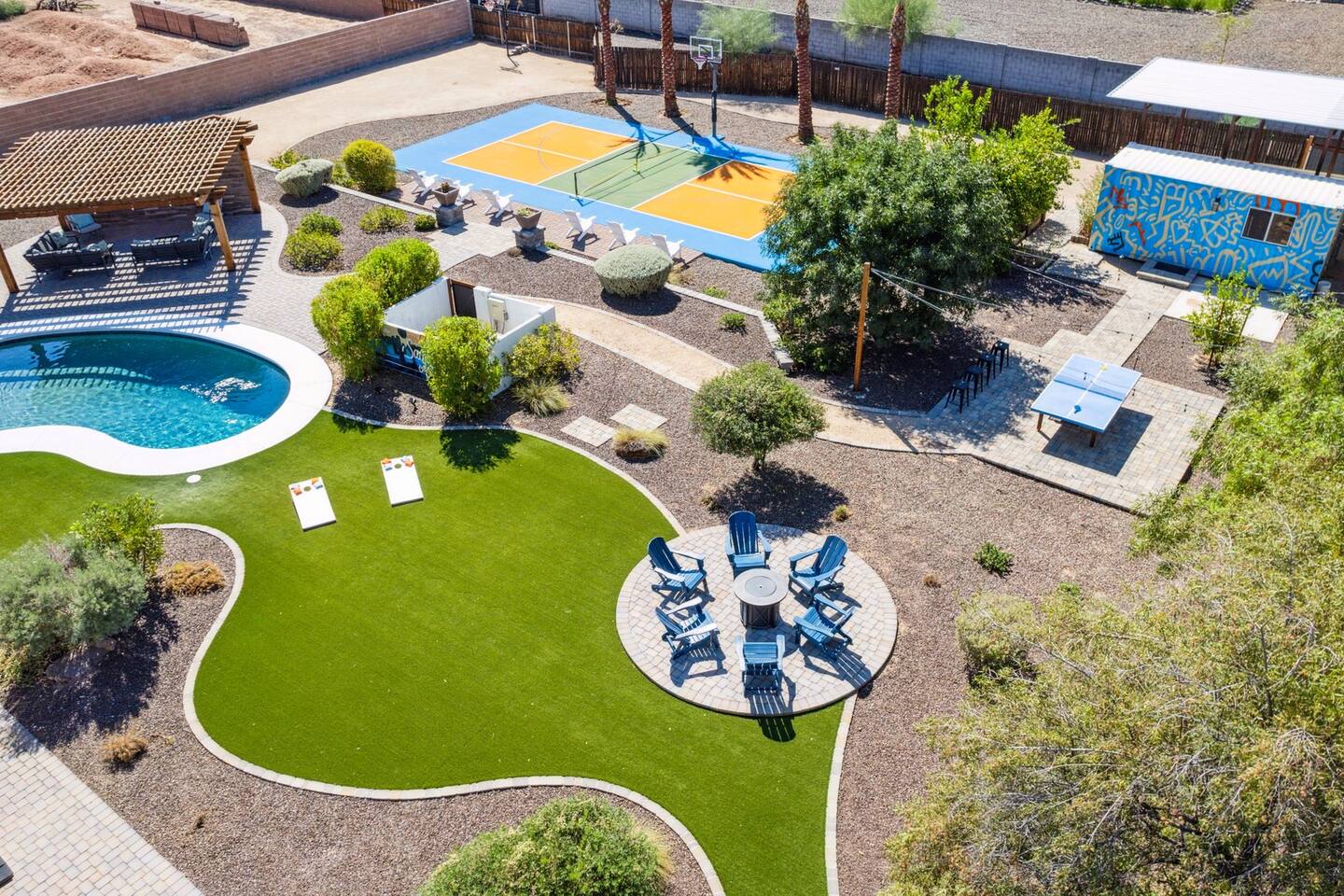 The space Sanctuary on Shea is a family friendly oasis located in Scottsdale. The property is geared towards allowing the whole family to enjoy all the sunshine Arizona has to offer! All game accessories are included with the property to enjoy * Private Pool - Child safety fence available for install upon request * Heated Pool - Available at $100/night * Hot tub * Pickleball court * Basketball court * Outdoor Ping Pong * Bocce Ball Court * Corn Hole * Horseshoe Toss * Yard Dice * Poolside Grill * Gas Firepit * Games The home is immaculately cleaned and includes all of the essentials to allow for a comfortable and enjoyable stay! Including but not limited to the items below: o Poolside Gas Grill o Cornhole Boards/Bags o All games accessories are provided o Outdoor patio table o Outdoor play area o Toaster o Drip Coffee Maker - filters and starter packs of coffee & creamer are provided o Microwave o Blender o Cooking Essentials o Pots & Pans o Silverware o Plates, Bowls, Glasses etc. o Washer/Dryer o Detergent o Board Games o Iron o Hangers o Hair Dryer o Shampoo, Conditioner and Body Wash o Bed Linens o Extra pillows and Blankets o Family owned - nearby for immediate assistance if needed Primary 1 - King size bed Primary 2 - King size bed Bedroom 3 - King size bed Bedroom 4- King size bed Bedroom 5- Two full bunk beds *All bedrooms have an ensuite bathroom* PLEASE NOTE: Pool Heating is available for $100 per night of your reservation. The pool will be heated and ready to enjoy at our time of check in time. Child safety pool fence available for installation during your stay. Minimum 7 day advance notice is needed prior to your check in date. House is monitored with exterior cameras for guest safety and security. Please contact Nick, our property manager at Copper Valley RnR Vacation Rentals, for any additional questions.