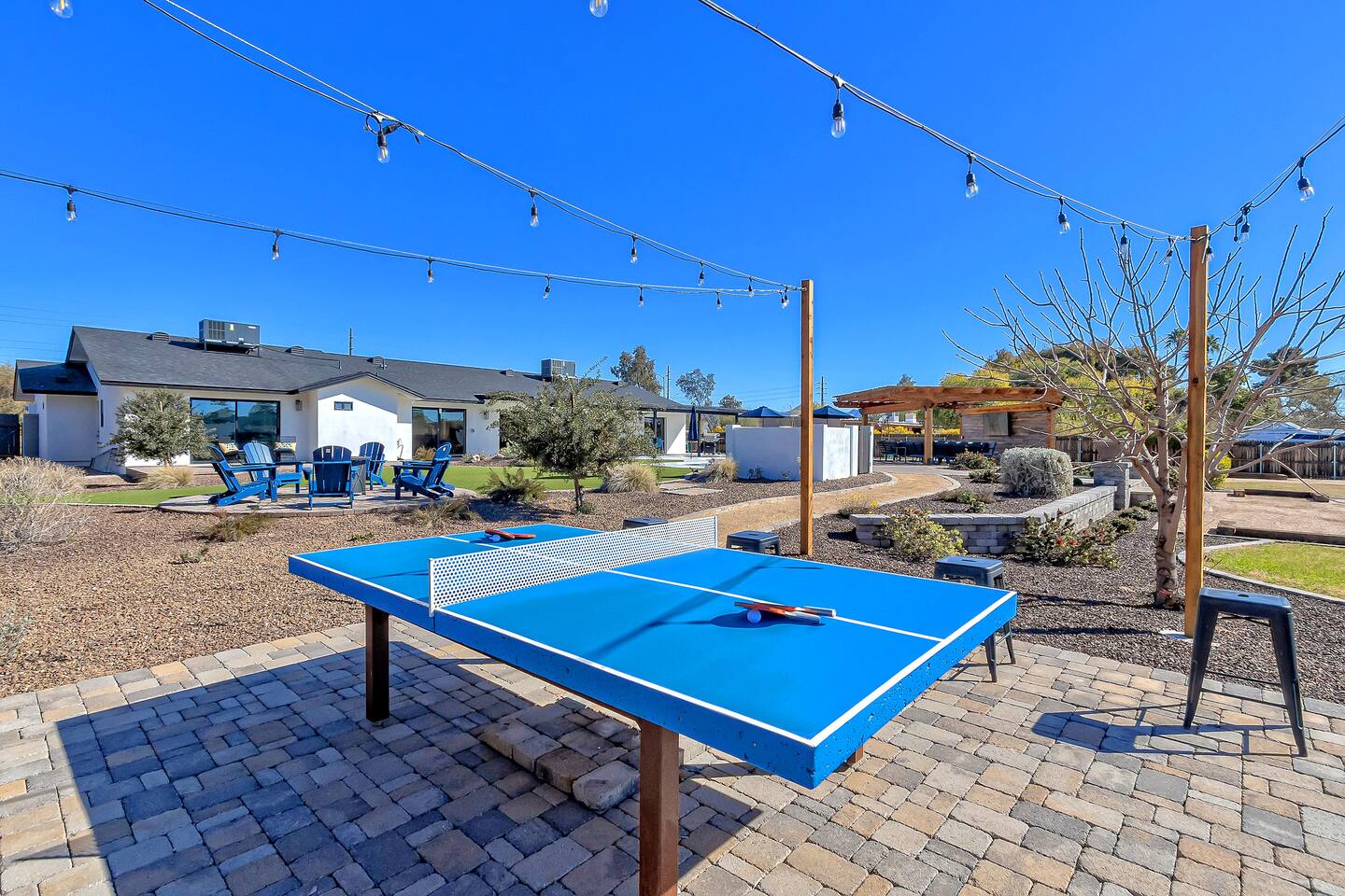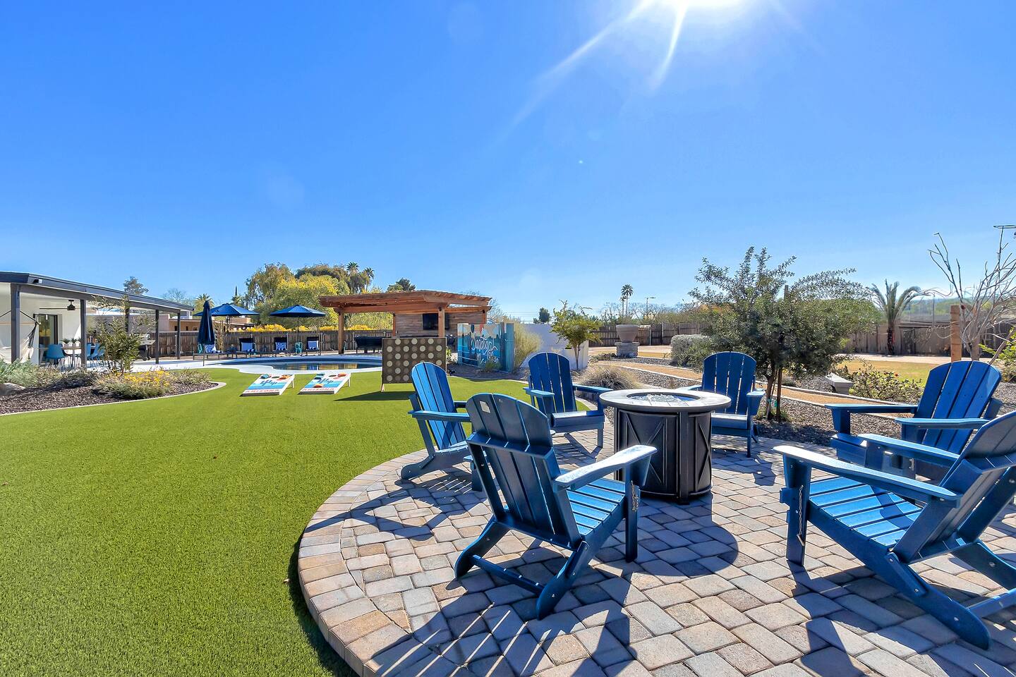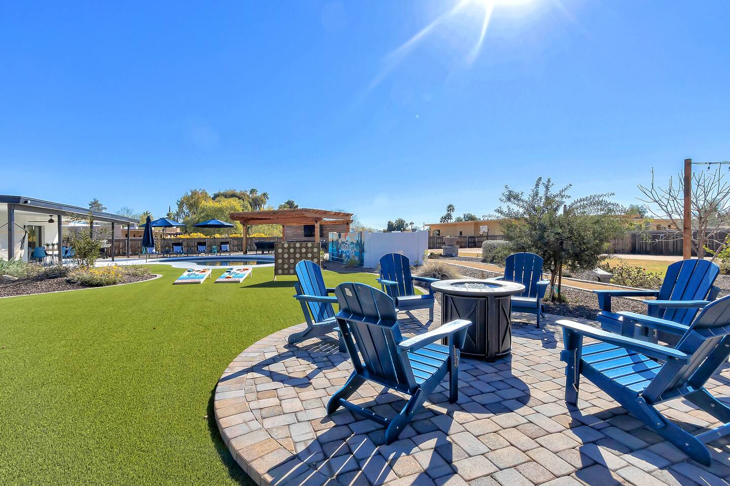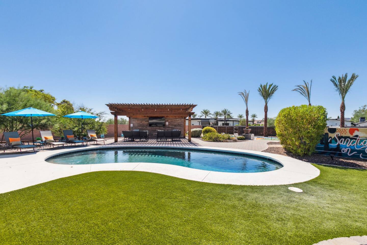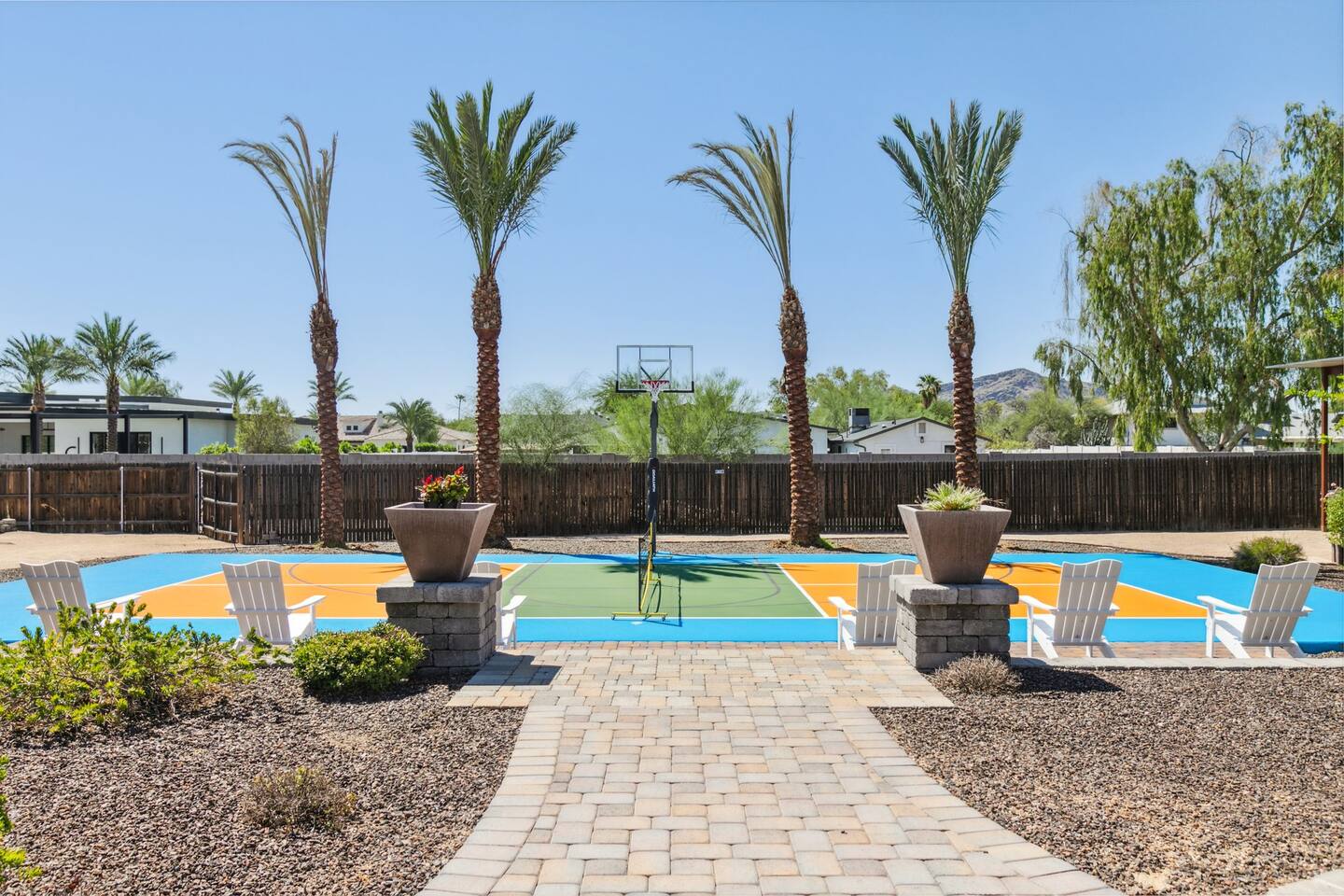 The space Sanctuary on Shea is a family friendly oasis located in Scottsdale. The property is geared towards allowing the whole family to enjoy all the sunshine Arizona has to offer! All game accessories are included with the property to enjoy * Private Pool - Child safety fence available for install upon request * Heated Pool - Available at $100/night * Hot tub * Pickleball court * Basketball court * Outdoor Ping Pong * Bocce Ball Court * Corn Hole * Horseshoe Toss * Yard Dice * Poolside Grill * Gas Firepit * Games The home is immaculately cleaned and includes all of the essentials to allow for a comfortable and enjoyable stay! Including but not limited to the items below: o Poolside Gas Grill o Cornhole Boards/Bags o All games accessories are provided o Outdoor patio table o Outdoor play area o Toaster o Drip Coffee Maker - filters and starter packs of coffee & creamer are provided o Microwave o Blender o Cooking Essentials o Pots & Pans o Silverware o Plates, Bowls, Glasses etc. o Washer/Dryer o Detergent o Board Games o Iron o Hangers o Hair Dryer o Shampoo, Conditioner and Body Wash o Bed Linens o Extra pillows and Blankets o Family owned - nearby for immediate assistance if needed Primary 1 - King size bed Primary 2 - King size bed Bedroom 3 - King size bed Bedroom 4- King size bed Bedroom 5- Two full bunk beds *All bedrooms have an ensuite bathroom* PLEASE NOTE: Pool Heating is available for $100 per night of your reservation. The pool will be heated and ready to enjoy at our time of check in time. Child safety pool fence available for installation during your stay. Minimum 7 day advance notice is needed prior to your check in date. House is monitored with exterior cameras for guest safety and security. Please contact Nick, our property manager at Copper Valley RnR Vacation Rentals, for any additional questions.