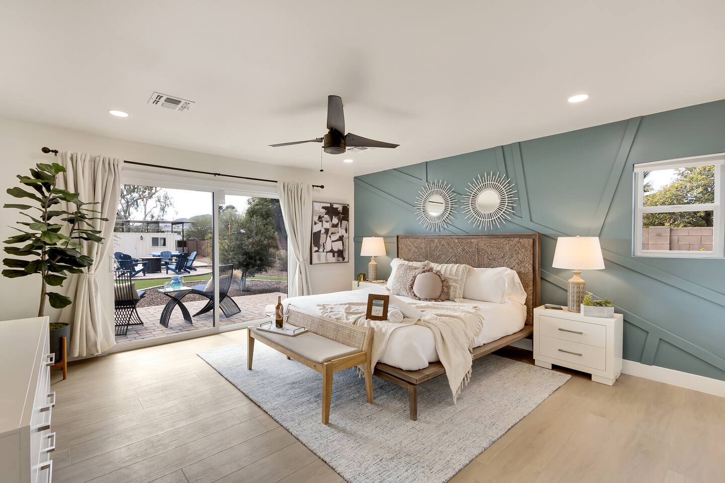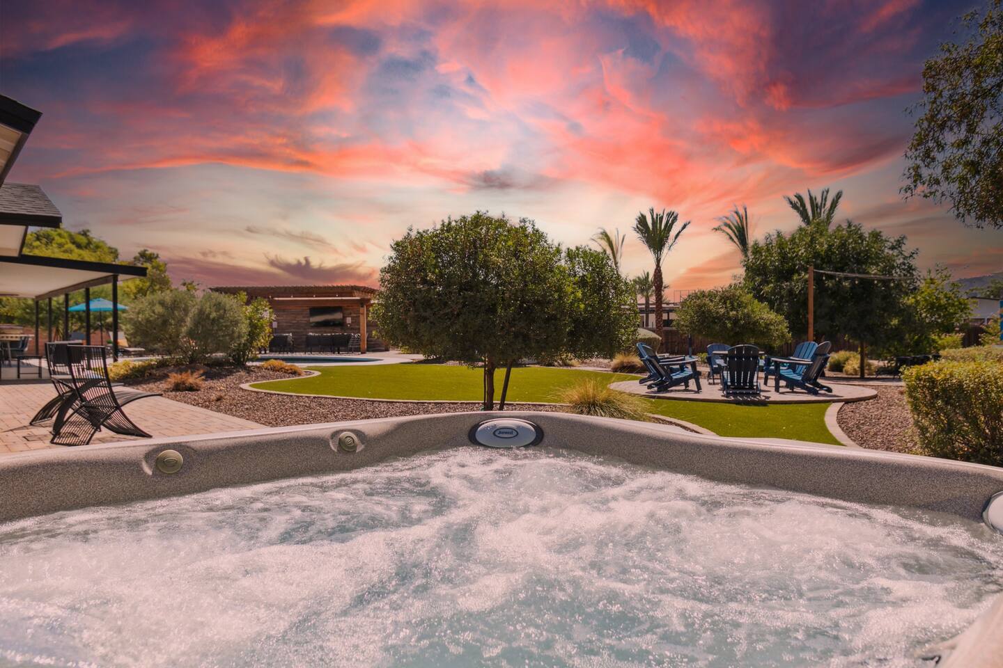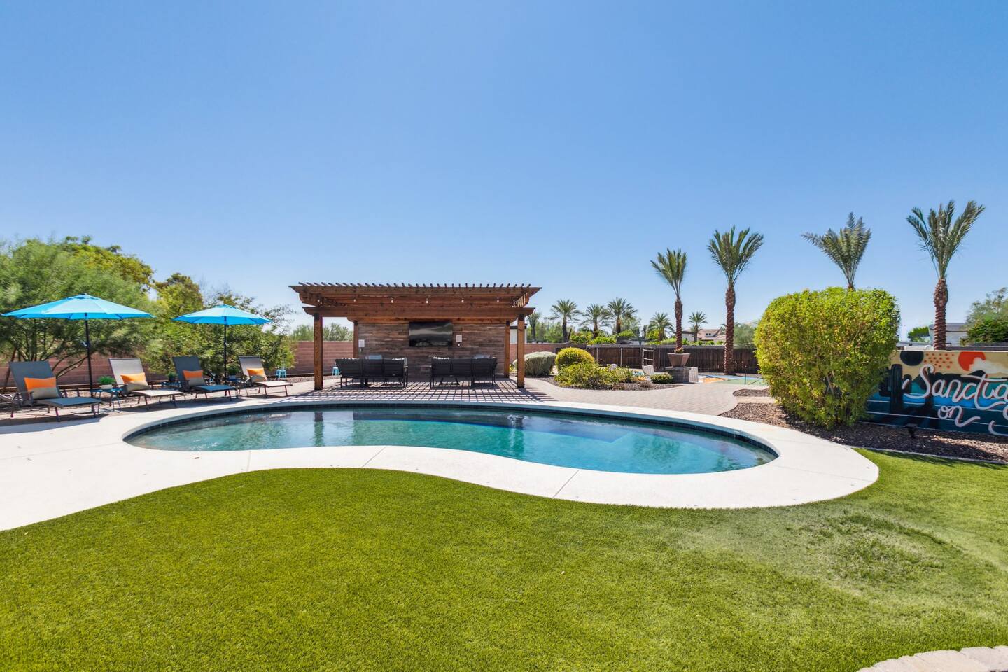 Sanctuary on Shea is a 5 bedroom/ 5 bath private home located on an acre lot. Brand new pickleball, basketball court, and hot tub were just added! The property features 2 primary bedrooms, 2 large dining areas, a covered gazebo with outdoor tv, heated pool, outdoor ping pong table, bocce court and so many games! Nearly one million dollars was put into renovating this amazing property. The sprawling backyard is stocked with fun for the whole family. You won't find any other property like it!